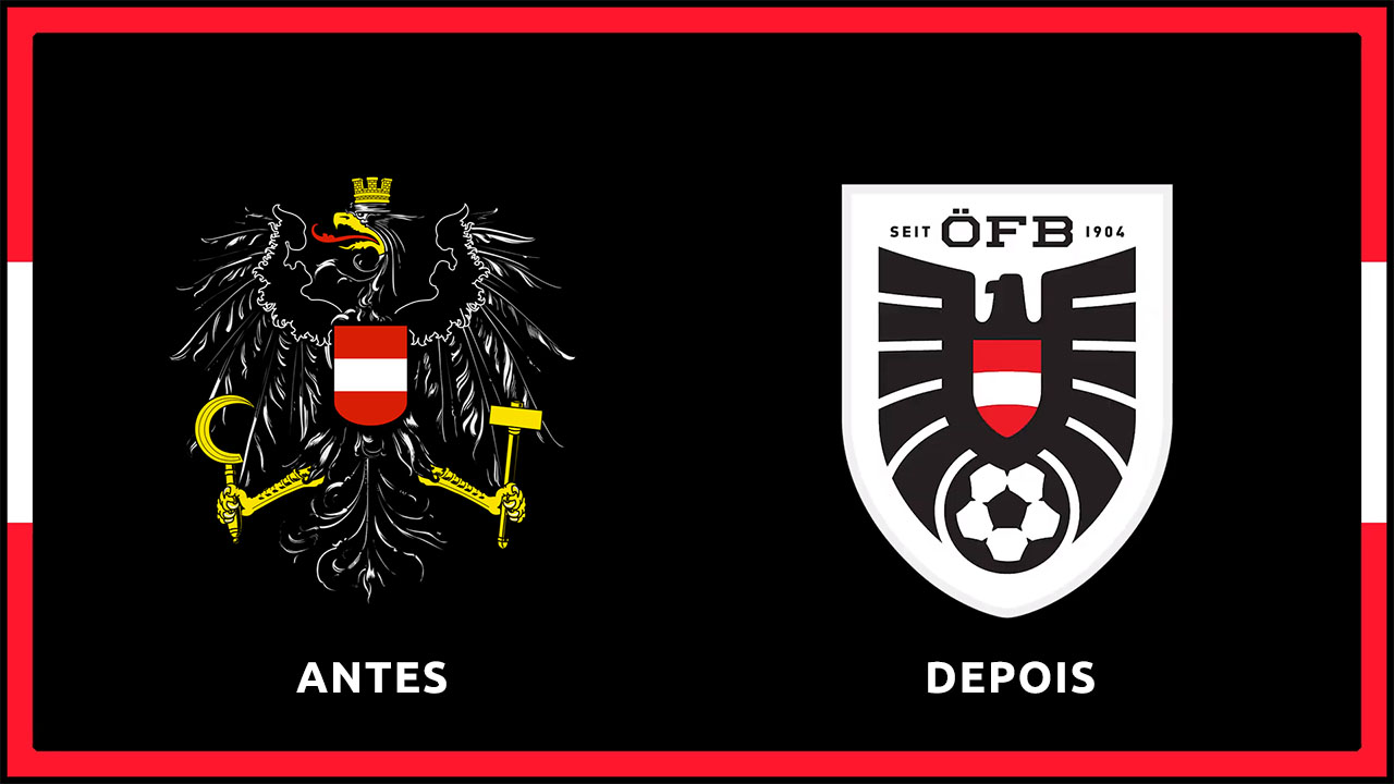 - Por exemplo: dando ao seu Brasão de Armas (à esquerda, na perspetiva abaixo de «antes» e «depois») um estilo mais sofisticado, o novo emblema mantém a águia negra, símbolo da nação, em evidência. No entanto, não se trata apenas de uma valorização estética; há, pelo contrário, significados nacionais que se fundem em prol do novo escudo da Federação Austríaca de Futebol. Constituída por uma dezena de penas, a águia do novo design junta a paixão do amor à pátria com a do amor ao futebol: sendo a águia parte do Brasão de Armas enquanto sinónimo patriota da força e coragem dos austríacos, esta acaba por ganhar uma dimensão futebolística, na medida em que, tendo em conta as suas dez penas, faz por honrar as nove administrações regionais do futebol da Áustria, bem como ainda a própria «Bundesliga» austríaca – principal campeonato do país.